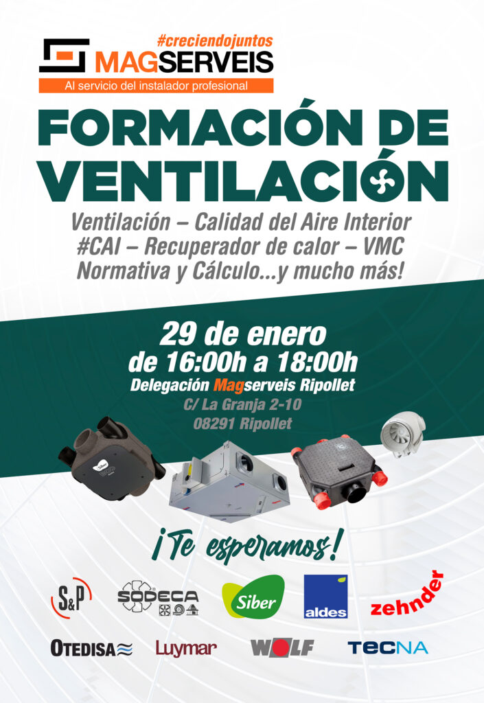Difusión – Aislamiento / Filtración – VMC (Ventilación Mecánica Controlada) – Recuperador de calor – Fancoils – Normativa actual…y mucho más!7 de marzo de 2024de 16h:00 a 18:00hMAGSERVEIS RipolletC/ La Granja 2-10(08291) Ripollet¡Te esperamos!